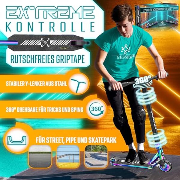 KESSER® Trottinette Freestyle | Trottinette Freestyle X-Limit | Direction à 360° | Roulements à Billes ABEC 9 de 100 mm | Roues en polyuréthane | Robuste | Noir𝐏𝐄𝐑𝐅𝐎𝐑𝐌𝐀𝐍𝐂𝐄𝐒 𝐄𝐓 𝐐𝐔𝐀𝐋𝐈𝐓É 𝐌𝐀𝐗𝐈𝐌𝐀𝐋𝐄𝐒: cette trottinette freestyle robuste avec direction à 360°, système de direction IHC et frein métallique offre une sensation de conduite légère, maniable et professionnelle. Le large guidon en T en aluminium monobloc garantit une stabilité maximale, même lors de figures difficiles. 𝐒Û𝐑𝐄 𝐄𝐓 𝐑É𝐒𝐈𝐒𝐓𝐀𝐍𝐓𝐄: la surface antidérapante, les poignées renforcées et les vis entièrement scellées en aluminium garantissent une bonne adhérence et une qualité durable. Le frein à friction fiable permet des arrêts rapides et contrôlés. 𝐏𝐎𝐔𝐑 𝐋𝐄𝐒 𝐄𝐍𝐅𝐀𝐍𝐓𝐒, 𝐋𝐄𝐒 𝐀𝐃𝐔𝐋𝐓𝐄𝐒 𝐄𝐓 𝐓𝐎𝐔𝐒 𝐋𝐄𝐒 𝐍𝐈𝐕𝐄𝐀𝐔𝐗: idéal à partir de 8 ans, pour les débutants comme pour les avancés. Parfait pour apprendre des figures, entraîner son équilibre et sa coordination ou pour rouler à toute vitesse dans les skateparks et sur l'asphalte. 𝐋É𝐆𝐄𝐑, 𝐒𝐓𝐀𝐁𝐋𝐄 𝐄𝐓 𝐏𝐄𝐑𝐅𝐎𝐑𝐌𝐀𝐍𝐓: avec un peu plus de 3 kg, il est extrêmement léger, mais néanmoins robuste grâce à son cadre en aluminium. Les roues compétitives en PU haute rebond de 110 mm avec roulements ABEC 9 garantissent une vitesse élevée et une bonne résistance à l'abrasion. 𝐃𝐄𝐒𝐈𝐆𝐍 𝐔𝐍𝐈𝐐𝐔𝐄: l'aspect sportif et urbain est complété par des graphismes street art faits à la main – un véritable accroche-regard pour tous les fans d'action.